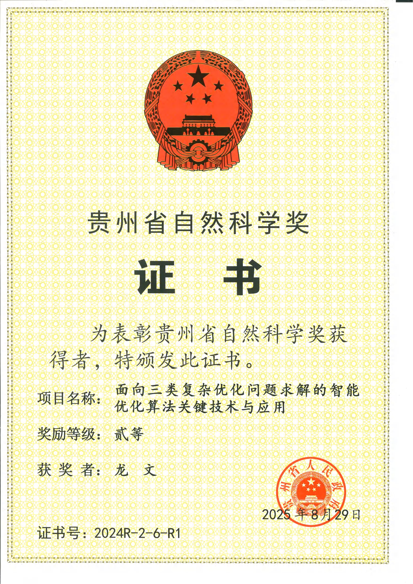 会上,我校bwin必赢龙文教授主持完成的“面向三类复杂优化问题求解的智能优化算法关键技术与应用”荣获贵州省自然科学奖二等奖。